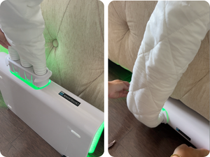 Take the control box, and plug the power cable in. Turn the control box on. It will flash green/red. then insert tubes side UP towards the bed, or oposite the white feet stickers. Slide the control box under the bed.